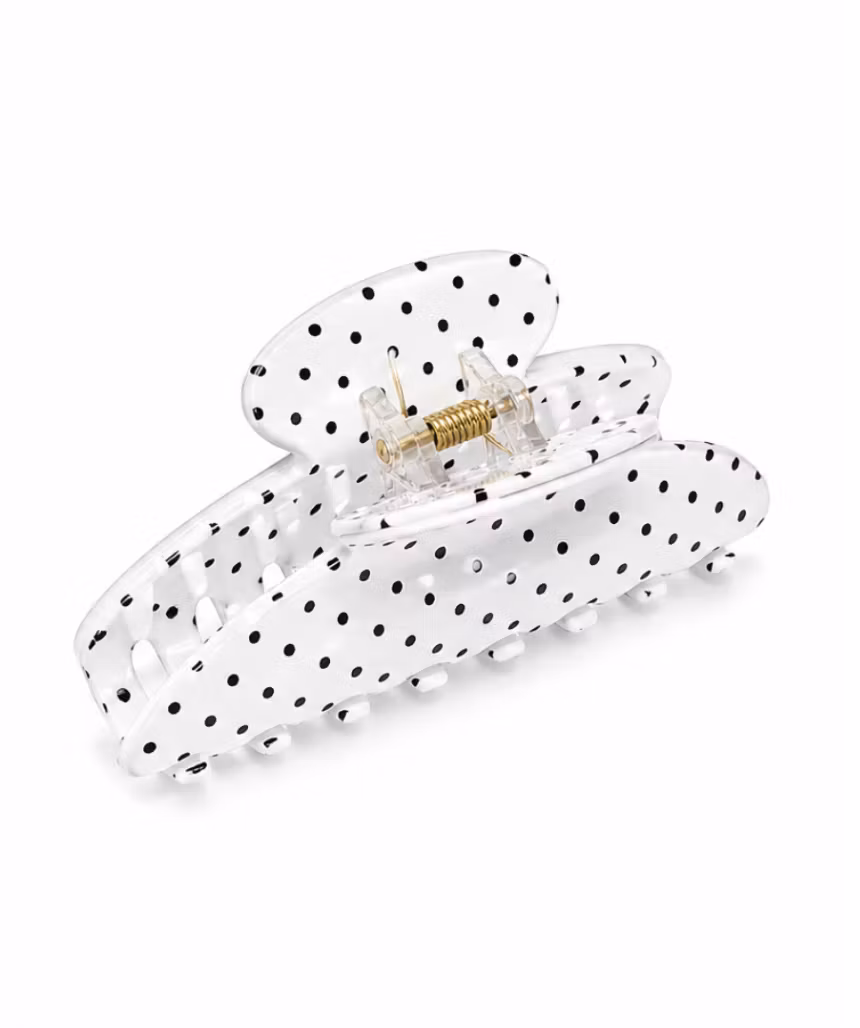 Fräsch, ljus och stilren, denna vita hårklämma med svarta prickar ger en clean och modern look som passar perfekt året runt. Den ljusa färgen gör den extra snygg i både mörkt och ljust hår.